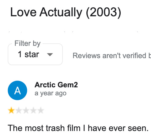 Last weekend I found myself with something very rare and unusual lying before me - ladies and gentlemen, I had a free weekend. Two whole days of no plans and no obligations, I felt giddy at the prospect, I felt chosen by a higher power, I felt #blessed. So when Friday night arrived, I settled into my trashcan and turned on my Ratflix, ready for an evening of relaxation and trash TV (literally). I skimmed through the options and landed on a film called ‘Love Actually’, I was drawn to it by a particular review which instantly caught my eye: